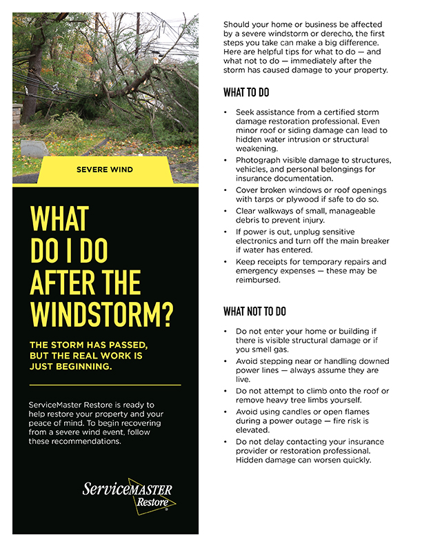 Whether it's a devastating derecho, violent wind gusts, or widespread structural damage, severe windstorms can leave behind more than just debris — they can upend lives and businesses. ServiceMaster Restore of Canada is here to help you clean up, rebuild, and recover with confidence.